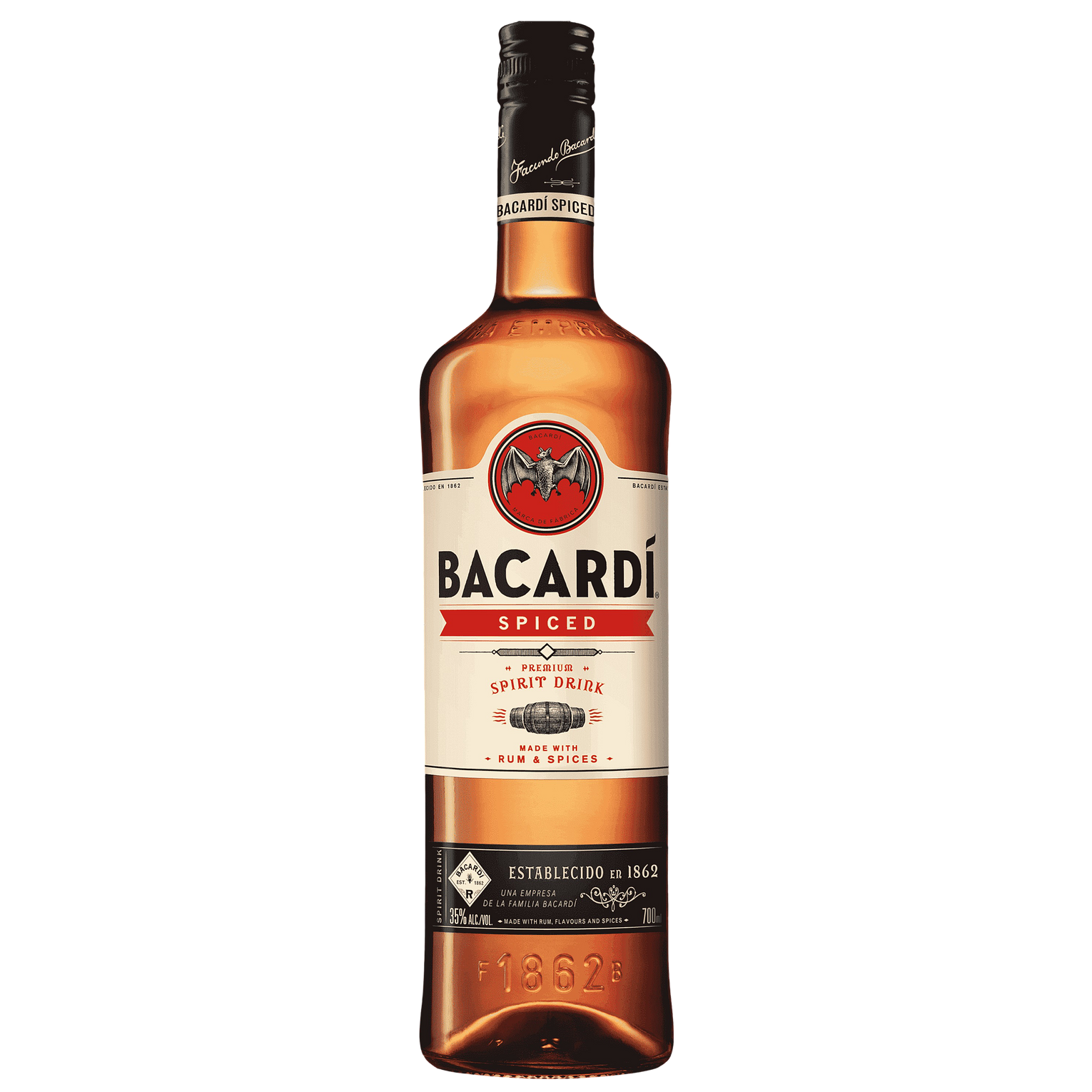 BACARDÍ Spiced Rum is a versatile and flavorful spirit that showcases the brand's expertise in rum blending and flavor innovation. Crafted from a blend of aged and unaged rums, this expression is mellowed in charred American oak barrels to impart subtle smokiness and depth, before being infused with natural flavors and spices. This careful process creates a harmonious balance of sweet and spicy notes that makes it exceptionally mixable while still being enjoyable on its own. The lower 35% ABV makes it approachable for a wide range of palates, while the gluten-free formulation ensures broad accessibility for cocktail enthusiasts.
