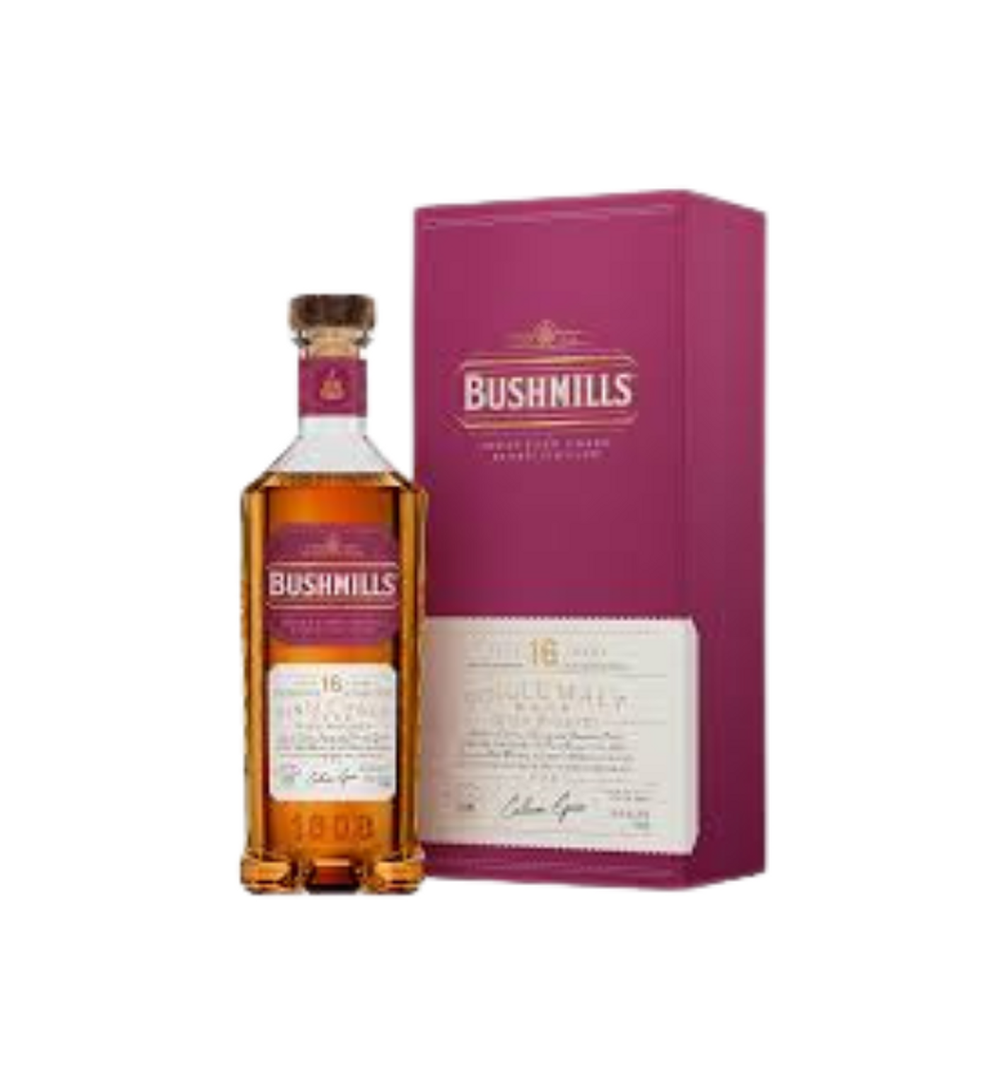 Bushmills 16 Year Old is a luxurious expression of Irish whiskey, triple distilled and matured in a rare combination of bourbon and Oloroso sherry casks before being finished in port pipes. This unique maturation creates a deep, complex whiskey with notes of juicy red berries, dark chocolate, roasted nuts, and a lingering sweetness balanced by oak spice.  Bushmills 10 Year Old showcases the craftsmanship of Ireland’s oldest licensed distillery. Triple distilled for remarkable smoothness, it is matured for a full decade in seasoned bourbon and Oloroso sherry casks. The result is a light, approachable single malt layered with honey, vanilla, ripe fruit, and gentle toasted wood.