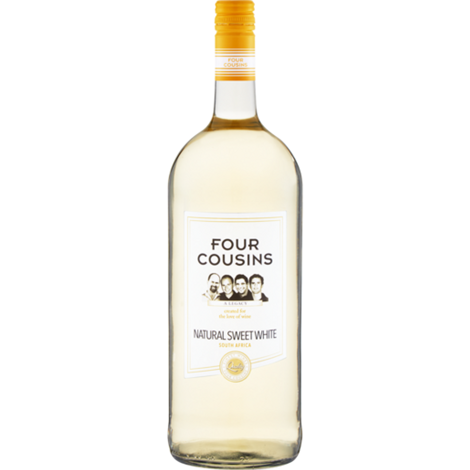 Four Cousins Natural Sweet White is a sweet, still white wine from South Africa, made with white cultivars and grape juice. Blended to be jammy and easy-drinking, its style emphasizes fruity aromas and lingering sweetness rather than dryness or oak influence.It is marketed for casual enjoyment—sundowners, light meals, desserts, and shared moments.