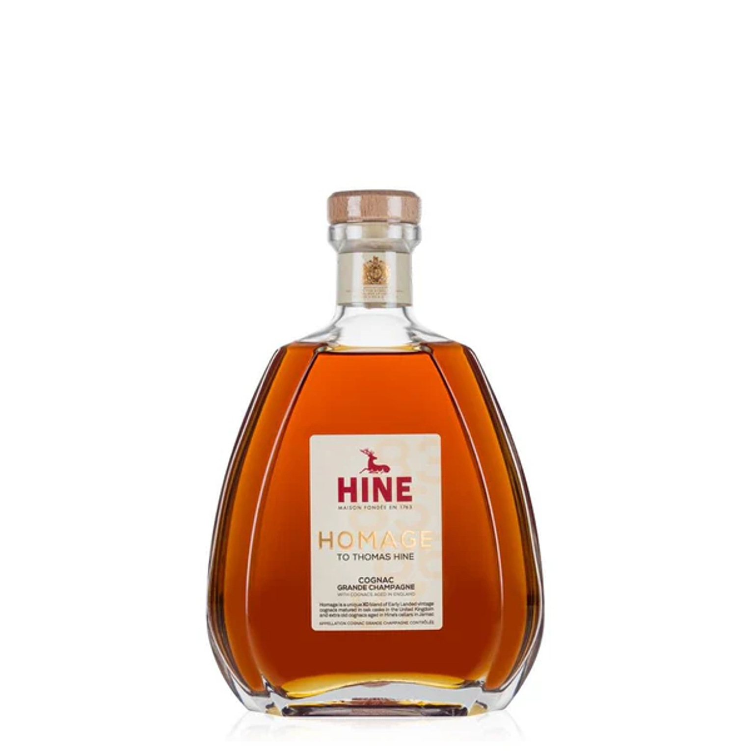 Hine Homage XO is a distinguished Cognac created to honor Thomas Hine, the visionary behind the house of Hine. This exquisite XO blend is composed primarily of Fine Champagne crus (Grande and Petite Champagne), with a portion aged in Jarnac’s cellars and some matured in the United Kingdom to bring unique complexity. Its character reflects both tradition and innovation, offering a sophisticated balance of fruitiness, spice, and elegance.